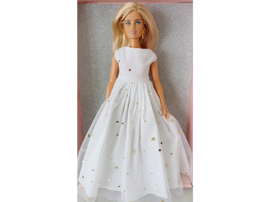 Barbie s náušnicemi a bílými šaty s hvězdičkami.