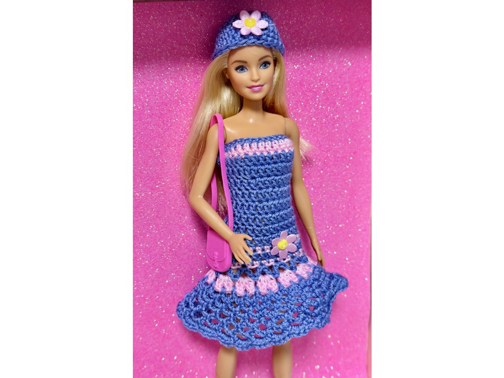 Barbie v háčkovaném outfitu s kabelkou a čepičkou.
