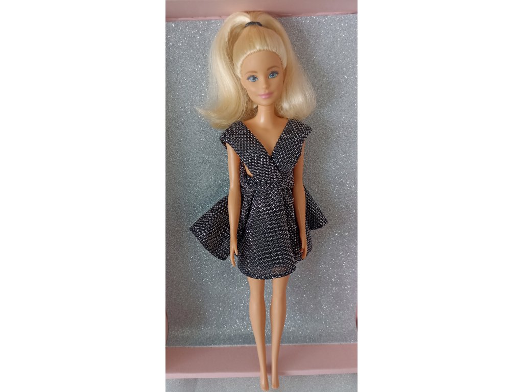 Barbie v krátkých večerních šatech s trendy culíkem.
