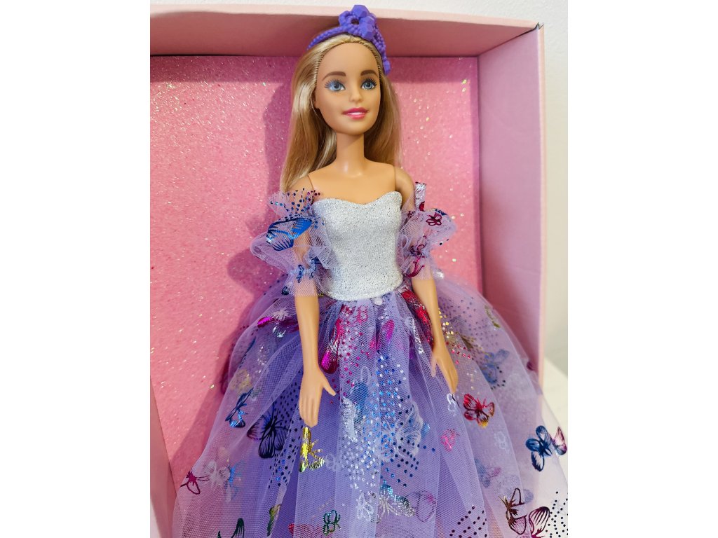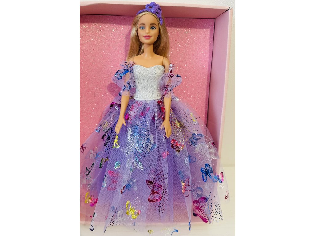 Barbie v plesových šatech s motýlky.