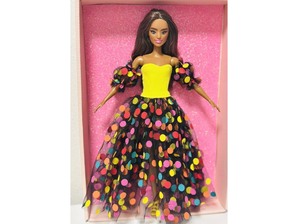 Barbie v plesových šatech s puntíky.