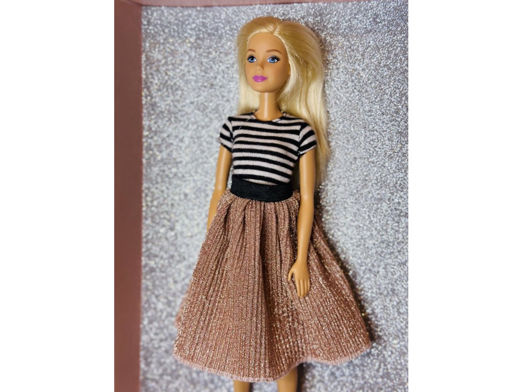 Barbie v nádherné plisované sukni a pruhovaným tričkem.