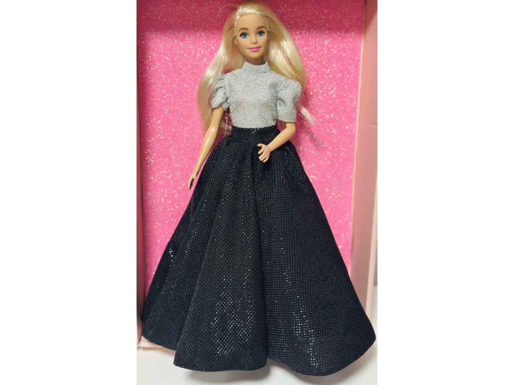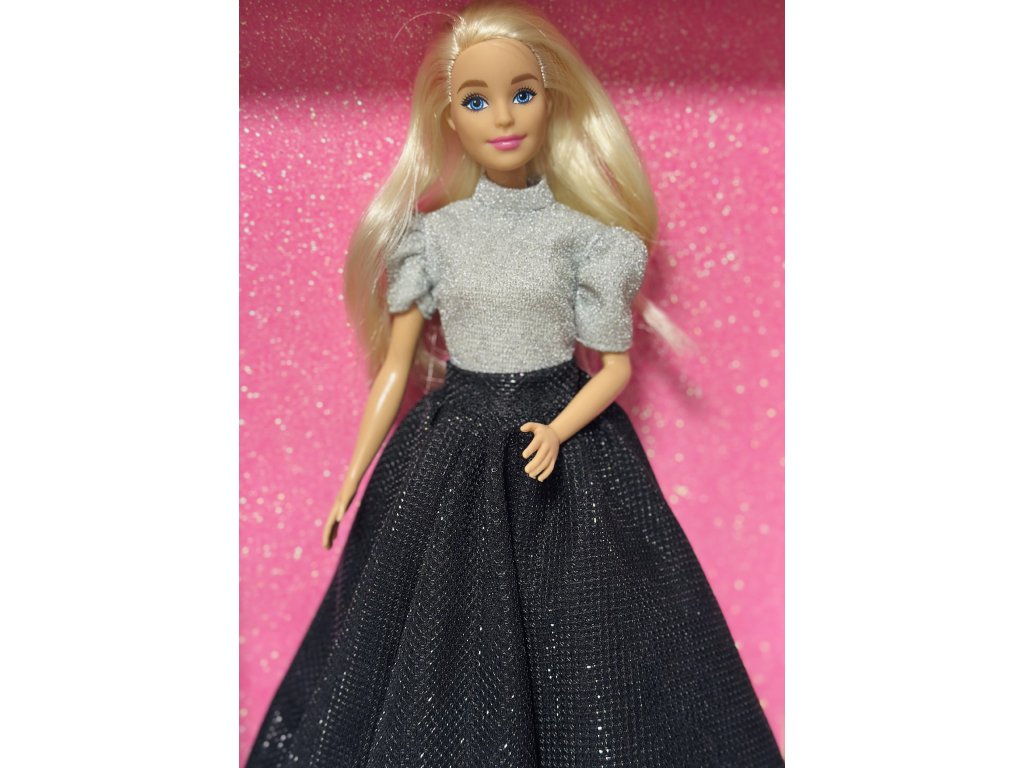 Barbie v plesových šatech. Outfit je složený z šité sukně a třpytivého topu.